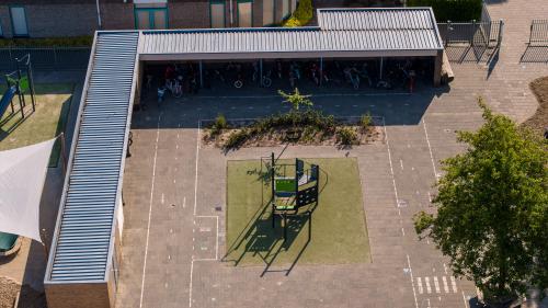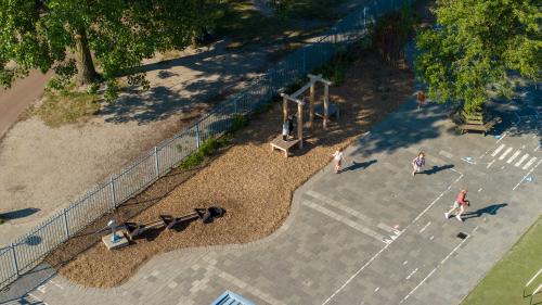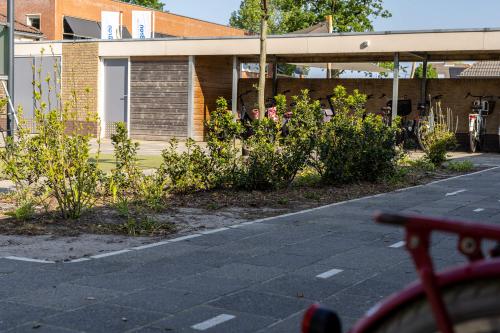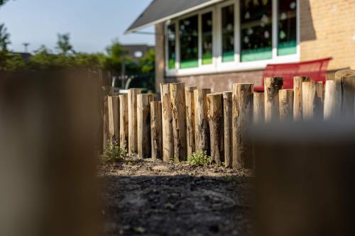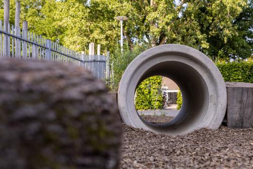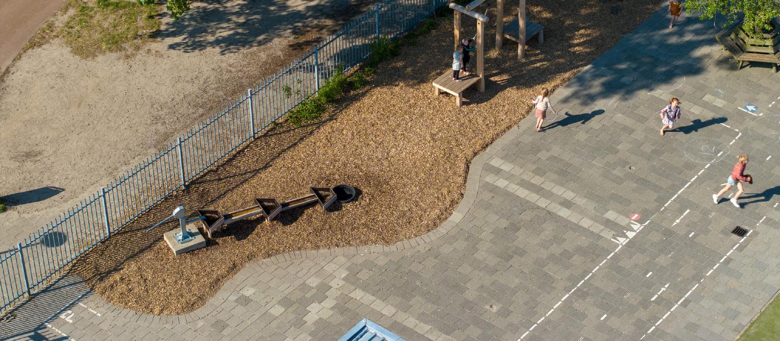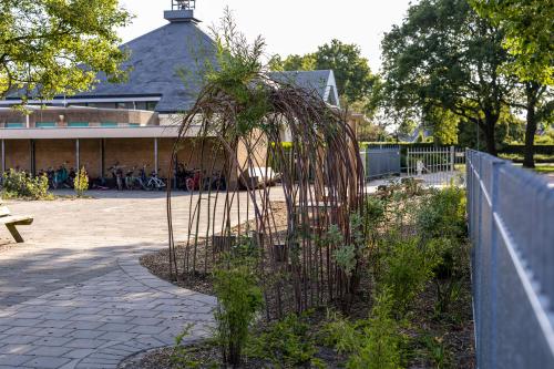 Ook is er een hele strook opengebroken om te vergroenen. Hier hebben we robuuste beplanting aangeplant wat tegen een stootje kan: de kinderen lopen er namelijk ook doorheen. Deze strook zal de komende jaren steeds verder dichtgroeien. Ook is er bij de meeste speelplekken boomschors aangebracht als valdemping en ondergrond. We hebben een wilgentenenhutje gebouwd waar de kinderen in kunnen spelen of verstoppen, stappaaltjes, klimbomen en een slingertouw. Het regenwater wordt opgevangen en afgewaterd door middel van natuurlijke infiltratie. En de grote plataan, geschonken door de Gemeente Harderwijk, is direct door SIGHT geplant om zo schaduw op het plein te creëren.