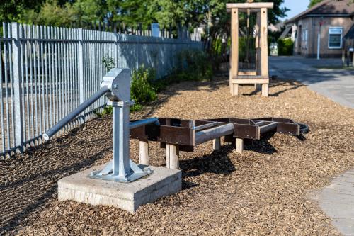 Bij Basisschool de Bron in plan Frankrijk, Harderwijk mocht SIGHT het bestaande schoolplein vernieuwen en vergroenen. Wat er stond is grotendeels gebleven maar er zijn verschillende toestellen bijgekomen en een avonturenstrook aan de zijkant van het plein. Hier staat een waterpomp, waterbakken om te kliederen en een rioolbuis waar je doorheen en overheen kan klimmen. De kinderen kunnen zich hier helemaal uitleven, gericht op natuurlijk spel.